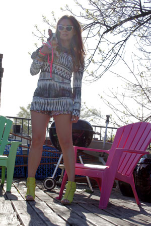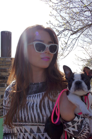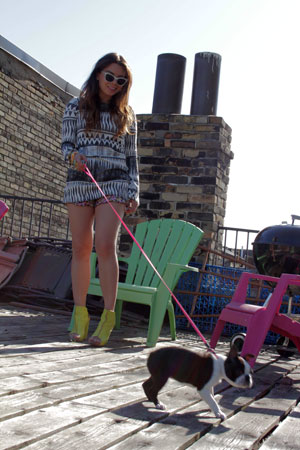 What I Wore: floral playsuit by Billabong $44 at West 49, Eva tunic by Element $50 at West 49, sunglasses from Buffalo Exchange in Brooklyn, shoes by Cacharel, puppy from a friend.