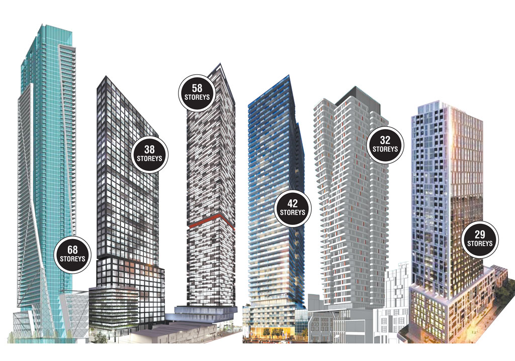 Proposed: The applicant is proposing a 68-storey, mixed-use residential building. The condominium would have retail space on the ground floor as well as commercial space and 672 residential units and 26 live/work units.