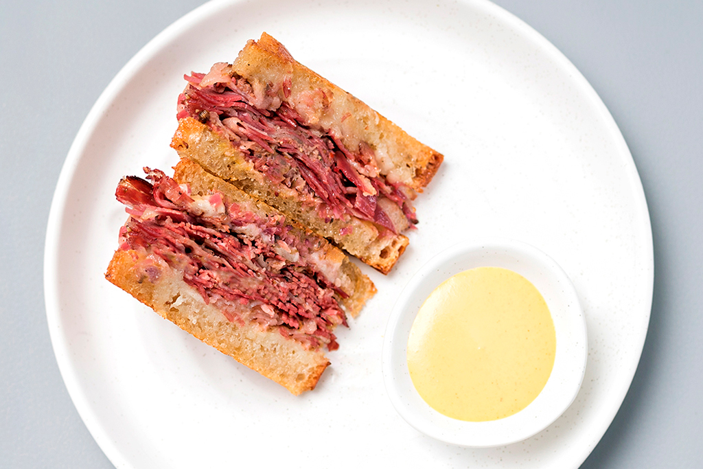 Nouveau-chic Sara, with its sleek marble table tops and delicate small plates, throws its wagyu Reuben ($18) into the ring. The house-cured wagyu beef literally melts in your mouth. Well-buttered ciabatta toast is accented with a red cabbage caraway-infused sauerkraut and an aged Gruyère cheese. Presented like a little finger sandwich, this contender is meant to be a small plate, but the meat is so decadent, two triangles is more than enough. The sandwich comes alongside a house-made truffle mayo that offers a welcome horseradish zip. All in all, this one is well worth the splurge.