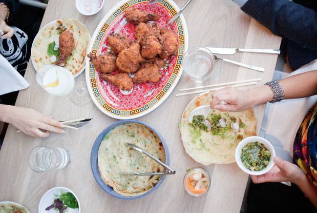 Like the other Momofukus, Daishō is casual. Servers are dressed in T-shirts, and food is served on plastic plates. For $125, diners get two whole chickens, around three pounds each, from a farm in Ontario. The birds are taken apart and cooked sous-vide in buttermilk for two hours, then they’re triple-dredged in flour and other spices before being quickly fried in super-hot canola oil. If you don’t use your hands, you’re a prude. And don’t forget to make use of the accompanying scallion pancakes.
