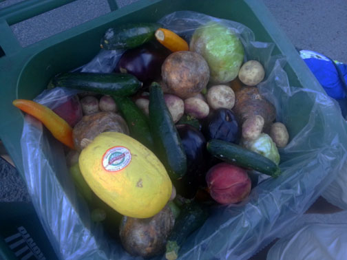 Our second pass through the market yielded some slightly blemished but easily edible produce from various green bins, including spaghetti squash, rutabaga and zucchini. Other bins offered oranges, mango, cabbage and kale. There was edible bread up the wazoo. All told, there was enough food to feed many people. The wastefulness of it all was overwhelming.