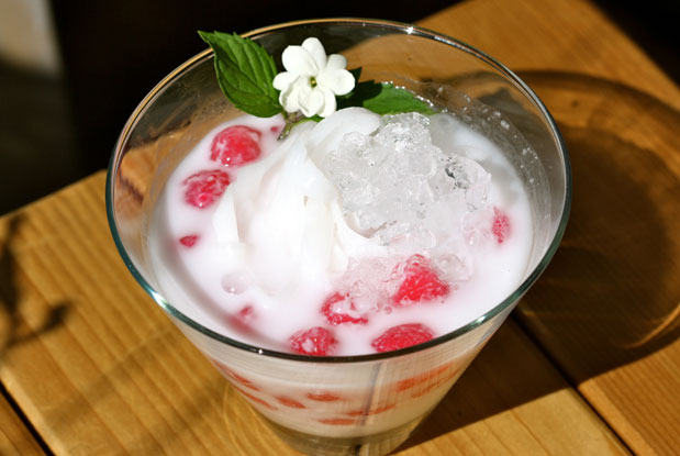 We went bananas for chef Nuit Regular’s tub tim krob (“red rubies”). The coconut milk-based dessert is dotted with ruby-coloured pearls that represent pomegranate seeds. These “red rubies” are in fact diced water chestnuts, coated in tapioca flour and cooked in a red Thai syrup called sala. The result is a gummy bear-like exterior with a crunchy centre that pairs perfectly with the jasmine-infused, smoked coconut milk. The dish can be served hot, but we prefer it over crushed ice.