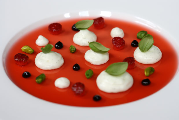 Orbs of buffalo mozzarella panna cotta sit on a bed of star anise-and-cinnamon infused strawberry jelly. Chef Rob Gentile curates his plate by perfectly positioning grappa-soaked Ontario strawberries, Sicilian pistachio, micro basil and dollops of 13-year aged balsamic.