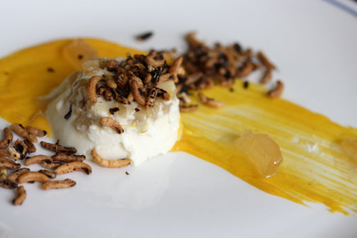 Aaron Joseph Bear Robe’s bosc pear and roasted citrus panna cotta is served on a plate painted with sea buckthorn curd. Jujubes of pear-and-sparkling-wine jelly and a sprinkling of puffed wild rice finish the dish.
