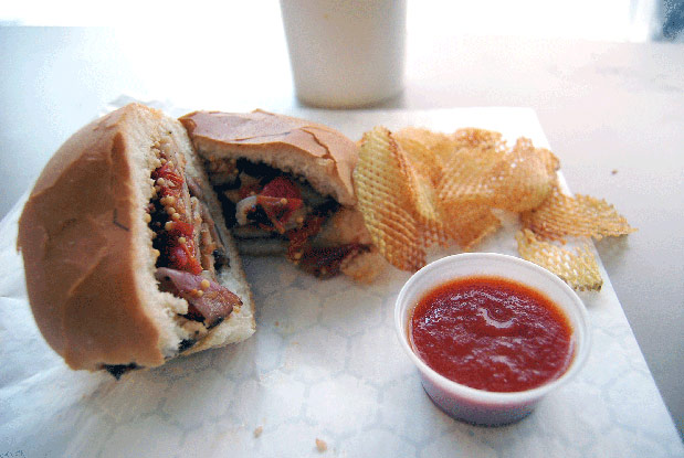 The brisket sandwich ($7.50) is hot smoked for 12 hours, and comes with coleslaw and chipotle sauce. The pork belly sandwich ($7.50) is cured for two days, braised and sliced, and then seared to order. It comes with charred tomato salsa, and is tender and flavourful. The roast beef sandwich ($7.50) comes from sirloin tip; it’s roasted, sliced thin and finished on the griddle.