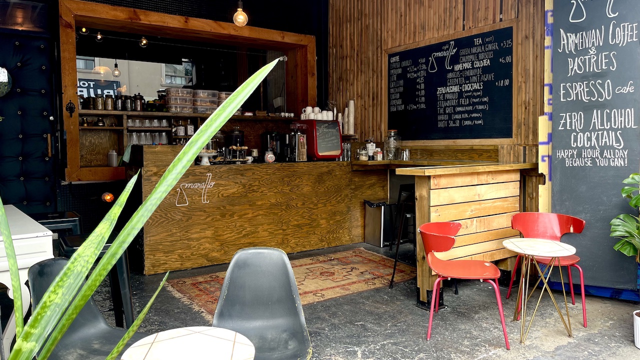 In addition to classic coffee options, as well as Armenian coffee, the cafe sells homemade cold teas (hibiscus lemonade, and green tea with mint agave), and mocktails like “The Marallo” featuring mint and zero-alcohol rum, The “Habibi” featuring ginger beer and zero-alcohol vodka, and “The Cher,” featuring pomegranate and zero-alcohol tequila.
