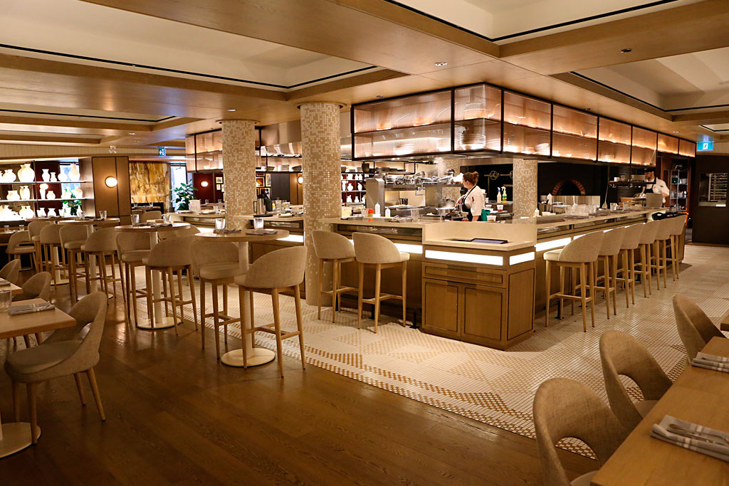 Inside the place, status continues to be conferred by its beauty. It’s a big resto (145 seats) carefully divided into intimate spaces, with a huge open kitchen as centrepiece. Illuminated shelves with white vases lighten the sexy dark, and velour banquettes and walls both dampen sound and lend luxe. As does the menu, a magical mystery tour of Italy and the Middle East, Milan inflected with Ankara. The name is a reference to Constantinople, the capital city of the Roman/Byzantine empire which is now Istanbul.