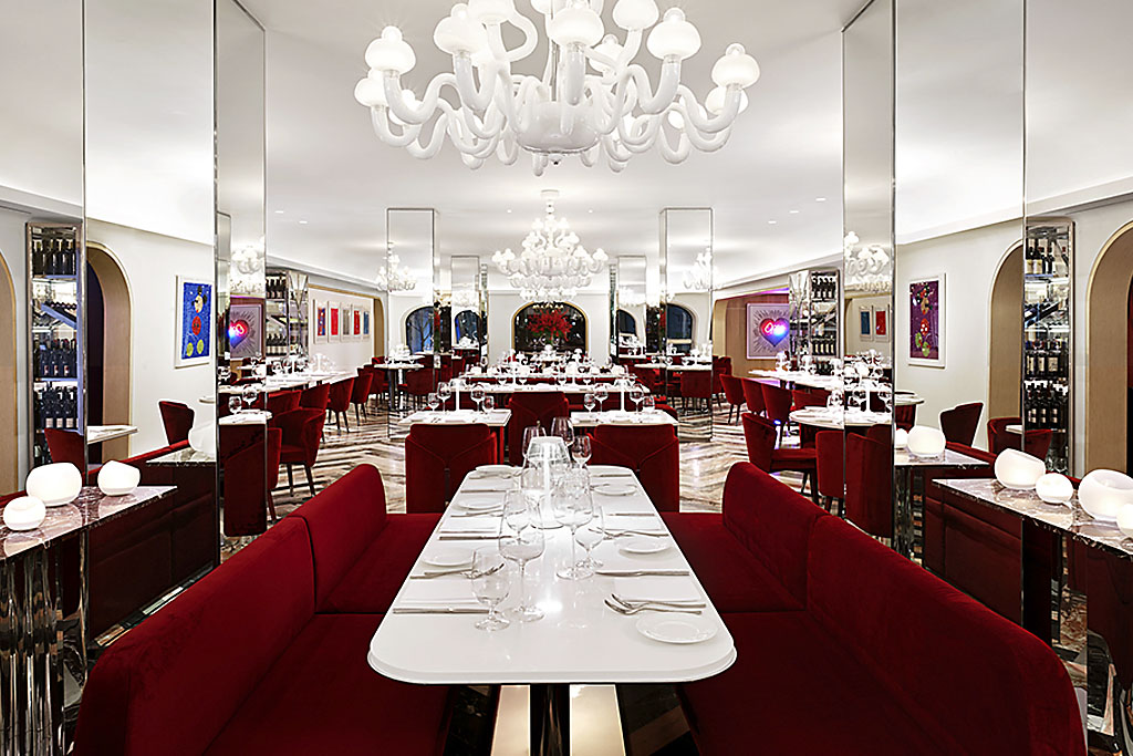 The floor is particularly arresting, herringbone strips of remarkable stone. Tables are white lacquer, chairs and banquettes are plush cranberry velvet, and everywhere light reflects from the many milk glass chandeliers. Mirrored columns and walls. There’s even a crooner at a white baby grand on a platform.
