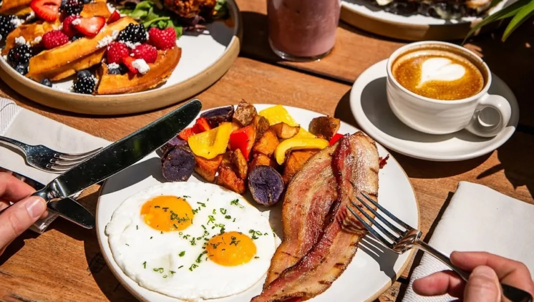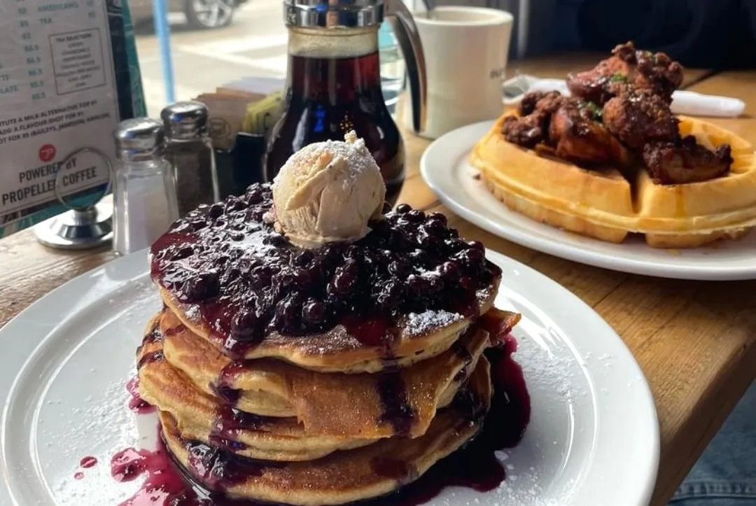 In Little Italy, pancakes take centre stage at Old School, especially the standout Blueberry Hill. Served in a cast-iron pan, these pancakes come loaded with blueberry compote, bacon and a generous ice cream–sized scoop of brown sugar butter — pure indulgence at your table.