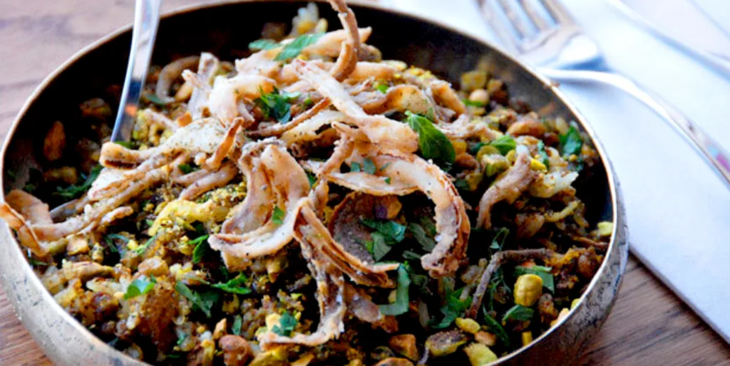 Fat Pasha serves Israeli, Ashkenazi and European Jewish flavours; Rose cites chef Yotam Ottolenghi as an inspiration. Rice is fried in schmaltz (chicken fat), then hit with lentils and a myriad of spices such as cinnamon, cloves and pepper, then topped with crispy fried onions and pistachios ($14). Hummus is topped with braised chick peas and slow-roasted lamb shoulder thatโs been marinated in zaโatar, sumac, mint and garlic ($15). For something deli-esque, there are chopped liver sandwiches served on challah ($16).