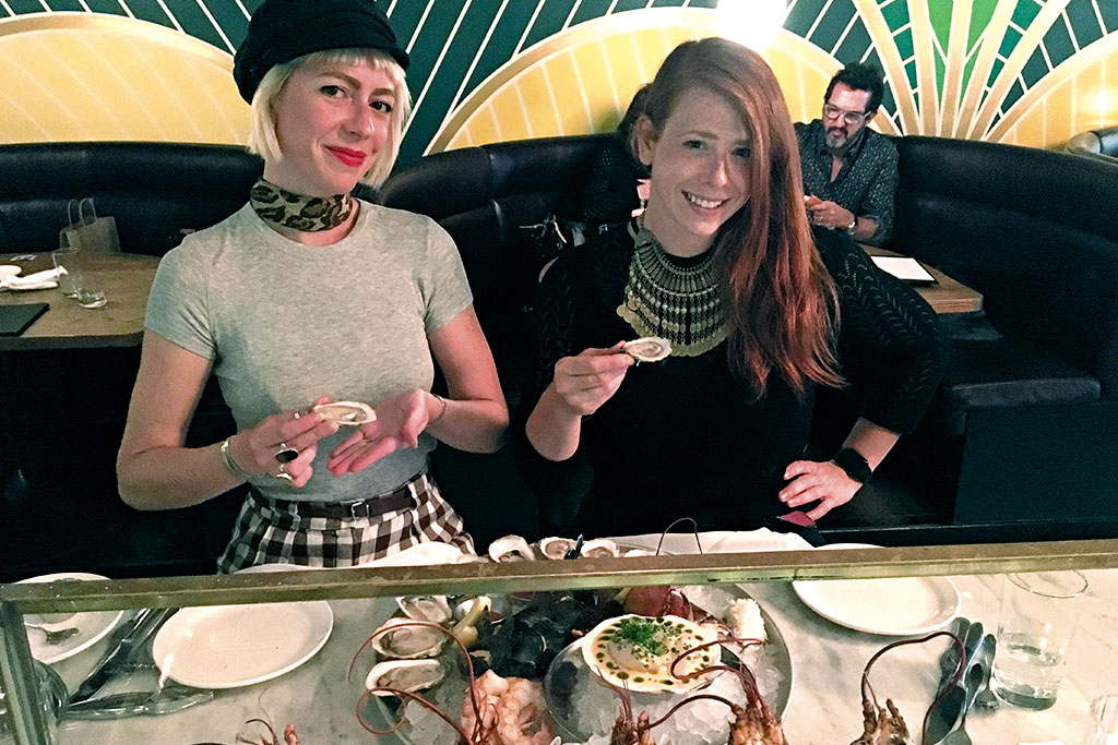 It’s piled high with bivalves and crustaceans: A heap of cold, plump mussels, which have been marinated in an espelette pepper vinaigrette, takes centre stage. Meanwhile, a dozen oysters sit in the orchestra pit, moving from Lucky Lime to Raspberry Point to the plump Beausoleil (the real crowd-pleaser). Tucked nonchalantly to the left is a half lobster (served with beurre monté sauce) and, on the right, five cocktail shrimp. The feast is crowned by a raw scallop marinated in a bath of champagne, garlic and buttermilk dotted with chive oil. We dine slowly, savouring every bite while happily ogling all the characters in the artful room.
