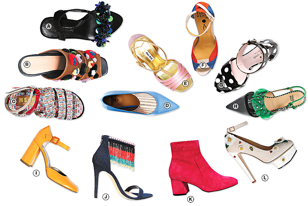 "I) These are just yummy! This Creamsicle colour is great for the season. J) Very sexy with the fringe coming off the ankle. It’s great to have a denim stiletto of this nature. K) It’s all about the colour with this Beatle boot. Just think of this as a seasonless shoe. L) Oh, I love Charlotte Olympia. This shoe looks like a little garden party with ladybugs and bumble bees and daisies.”