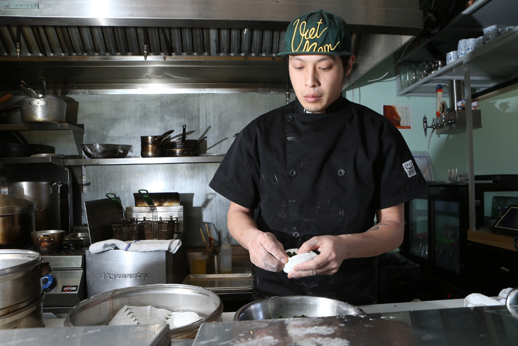 There are more steps to making the dumplings than there are actual ingredients: It begins with finely chopping handfuls of garlic chives, which his grandmother grew in her garden. A dough is formed out of water and a combination of tapioca and rice flours, which envelops the garlic chives. The dumplings are steamed and then pan-fried before being served with a sauce of black vinegar and chili oil. Et voilà: a flat, chewy, doughy, pan-crusty wrapper around a hefty mouthful of tightly packed garlicky greens. That’s the thing he resurrected from his childhood memories to kick off a menu of Vietnamese items.