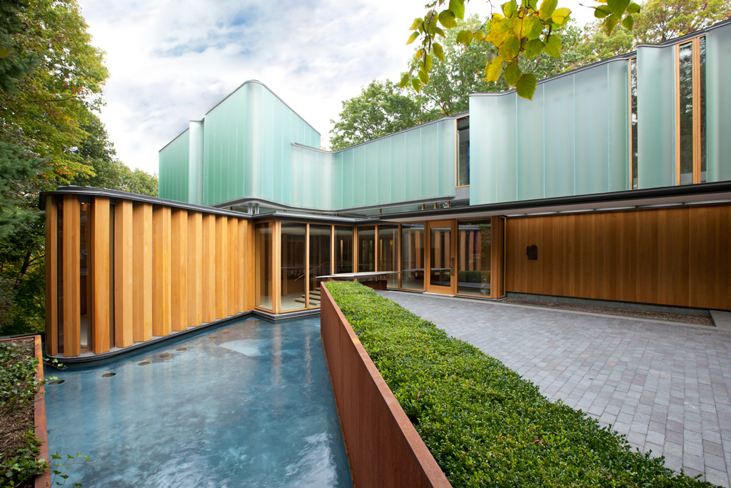 The house was built with a performance space that can handle an audience of about 150 people, with vertical oak fins and glass used alternately throughout its design, providing sun shading on the exterior as well as contributing to the acoustics on the inside. The curved walls are instilled with the memory of concerts and cantatas, along with the remarkable people who have gathered within them to listen or perform. David Bowie and Iman, Adrienne Clarkson, Justin Trudeau, Philip Glass, Joshua Bell, and Measha Brueggergosman are just a few of the prestigious guests. The space also held fundraising performances by Soundstreams and the Necessary Angel Theatre Company.