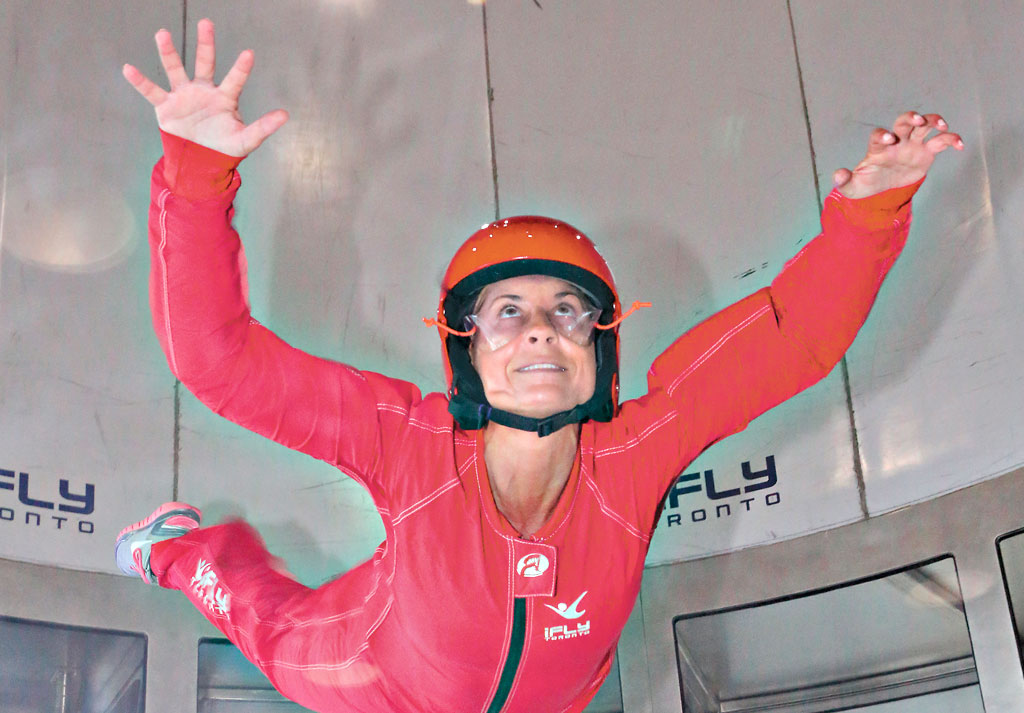 So what is indoor skydiving? Well, according to iFLY Toronto, it’s an opportunity to experience the sensation of free fall. Participants watch a video that gives an overview followed by classroom training of body position, hand signals, entrance and exit procedures and a safety briefing. You are then in a 14-foot cylindrical diameter vertical tube that is 45 feet tall, in which an airstream is passing at a speed of up to 250 kilometres per hour.