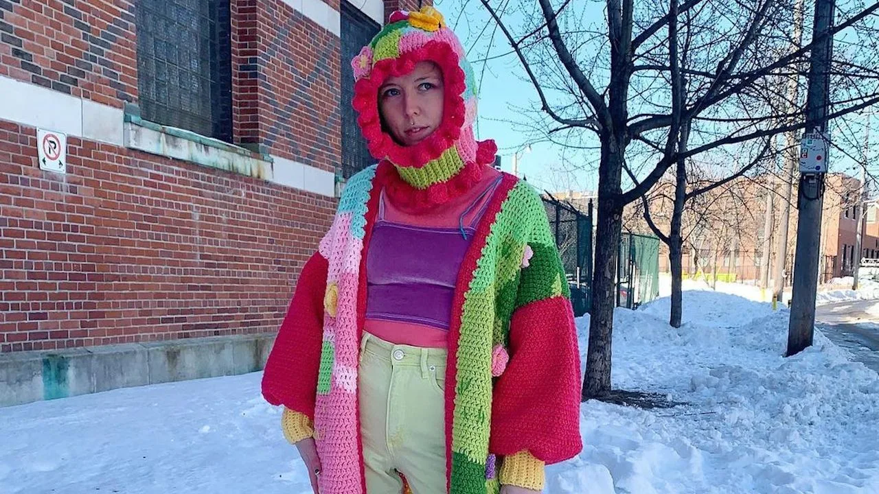 Aynsley Grealis is a viral Toronto artist who creates elaborate (and functional) crochet garments and accessories, such as embellished balaclavas and sculpturesque bags (carousel horses, espresso martinis, pizza rats…just to name a few designs). Her works vary widely in theme, from animals to food.