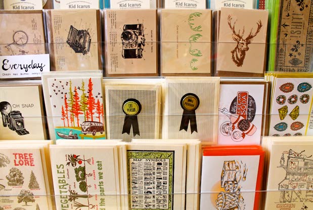 Up front, endless rows of cards fill shelves, with letterpress picks from The Regional Assembly of Text and Papillon Press joining prints from Kid Icarus itself. Limited-edition band posters of contenders for this year’s Polaris Music Prize liven one wall — grab a Handsome Furs one before they’re all gone — while fun finds from the likes of Fidoodle and Julie Moon and jewellery by rare specimens are dotted throughout the room.