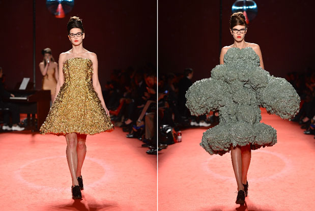 Wu tends to polarize people with his work; this collection was no different. Citing the idea of dystopia as his inspiration, Wu crafted a series of dresses out of polyurethane, a foam-like material that he moulded and painted after it had hardened. The resulting texture was akin to hardened chewing gum. Staying true to his aesthetic, Wu’s pieces became increasingly distorted as the show wore on; a gold mini dress transformed into more violent configurations, with the final model appearing to have been engulfed by a sage-coloured shrub. What it comes down to is that Wu is a boundary-pushing artist — he just works with the human form.