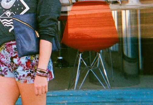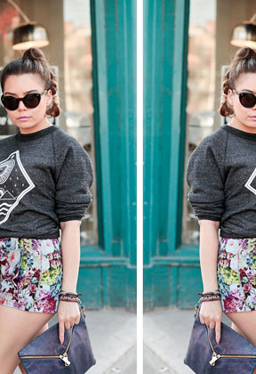 This outfit is a prime example of my ideal look for hanging out on Venice Beach. The sweatshirt is a boy’s top by a Toronto label called Handsome, which I love for its cool graphic print on the front. Paired with floral-print high-waist shorts by Dolce & Gabbana, an oversized envelope clutch and cat eye glasses, the overall look has a ‘50s pin-up girl feel, but with a tomboy twist (note the navy Converse).