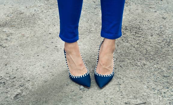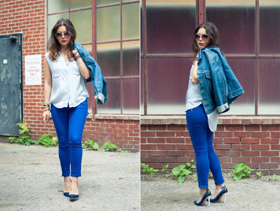 This is what I wore for National Denim Day. Yes, that is a head-to-toe denim look you are seeing. What I’d like to point out most is the pair of cobalt blue jeans. If you think they’re a $200 pair from J Brand, they’re not. They’re a pair of $25 jeans from Bluenotes.